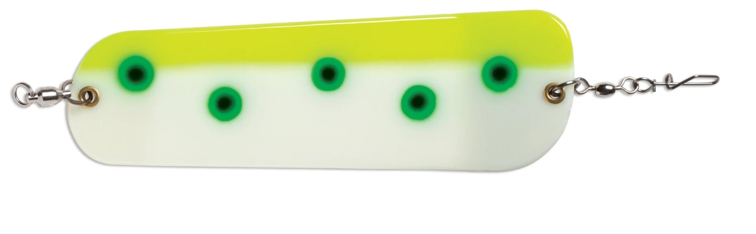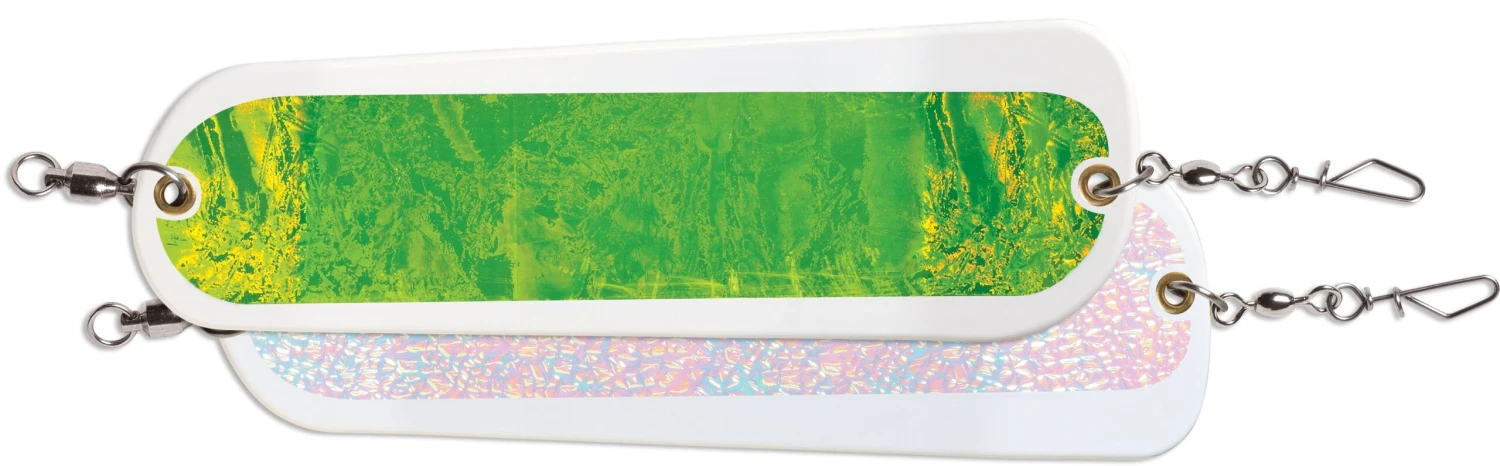 The Luhr-Jensen Coyote Flasher is the best deep water trolling device ever designed for attracting and catching big fish such as chinook salmon and lake trout. When pulled through the water, it develops a full 360 degree rotation. This churning motion creates sonic vibration and horizontal flash, which draws fish in from far away. Plus the unique erratic and pulsating action of the Coyote Flasher will hold the fish’s interest and prompt it to strike. Available in 2 sizes and 11 colors.